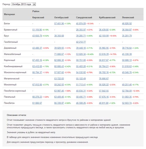 В любом отчете, показывающем текущие цены, есть возможность перехода к динамике изменения данной цены. Например, из просмотра средних цен по районам и материалам к просмотру динамике по выбранному району и материалу.