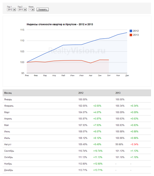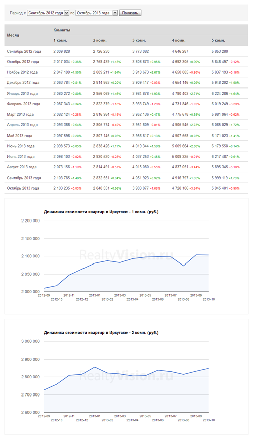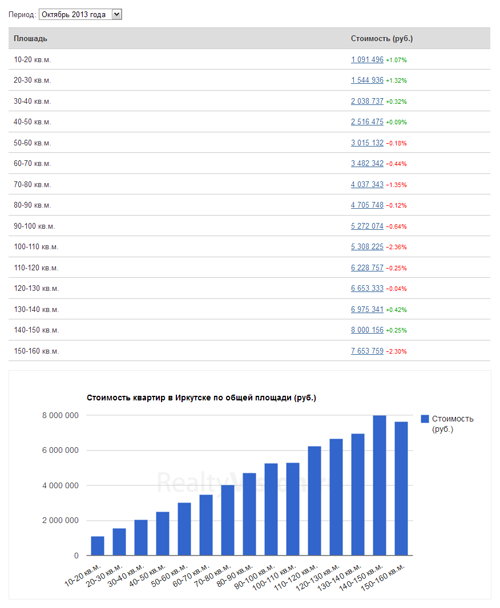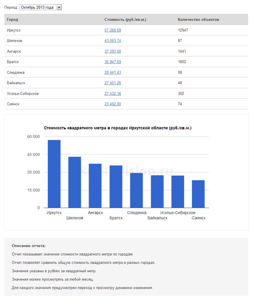 Инструмент показывает текущую стоимость квадратного метра и общую стоимость квартир в городах Иркутской области и позволяет сравнивать динамику изменения цен в разных городах.
