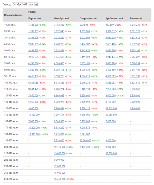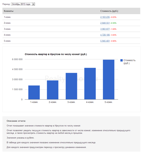 Инструмент показывает изменение средней общей стоимости квартиры в выбранном городе за выбранный период по месяцам (с разбивкой по районам, числу комнат, общей площади).