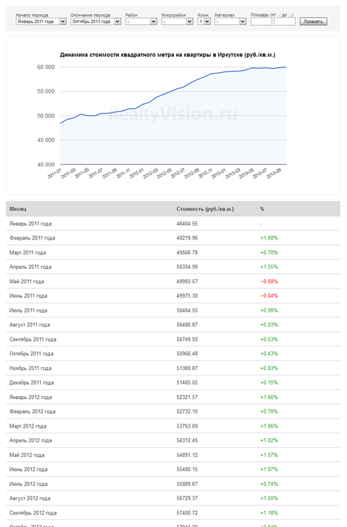 Инструмент показывает изменение средней стоимости квадратного метра на квартиры в выбранном городе за выбранный период по месяцам в зависимости от параметров, выбранных пользователем.