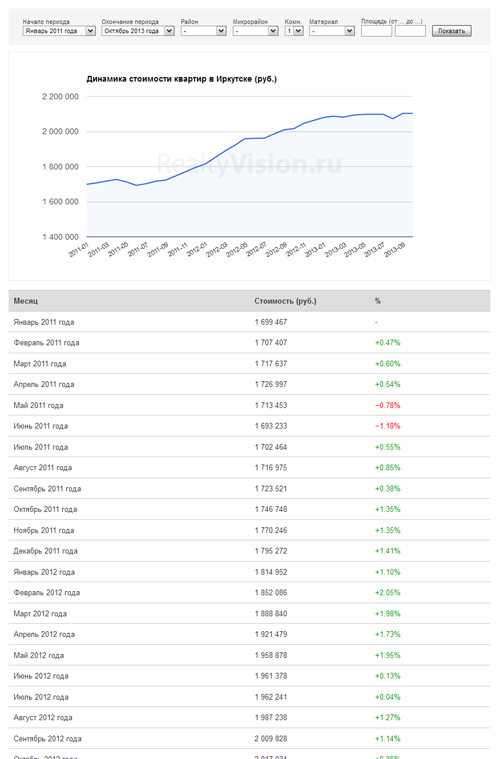 Инструмент показывает изменение средней общей стоимости квартиры в выбранном городе за выбранный период по месяцам в зависимости от параметров, выбранных пользователем.