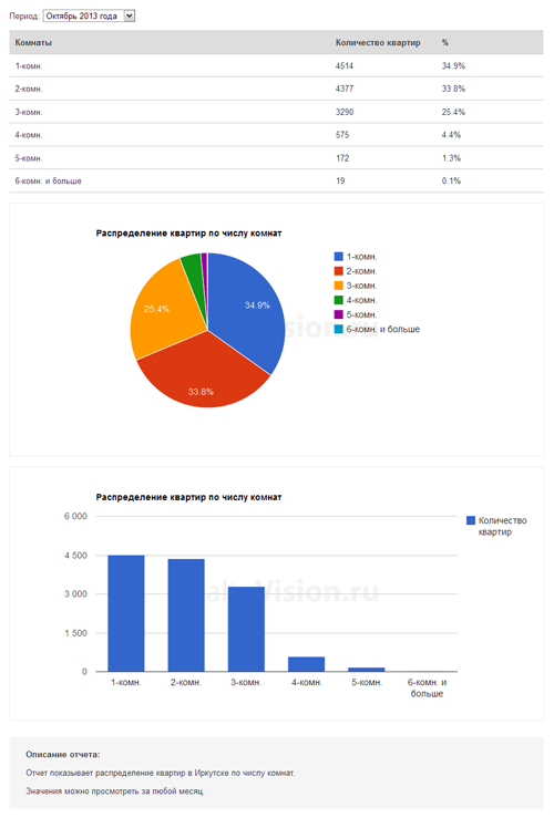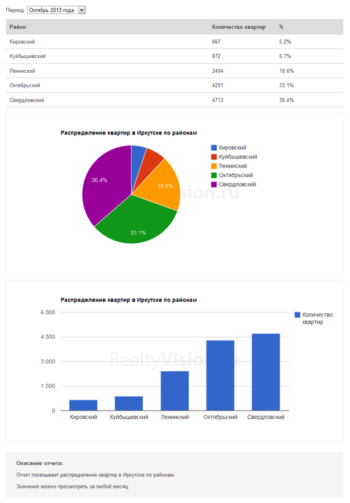 Инструмент показывает распределение квартир по районам, микрорайонам, числу комнат, общей площади, этажам, этажности зданий, материалам зданий.